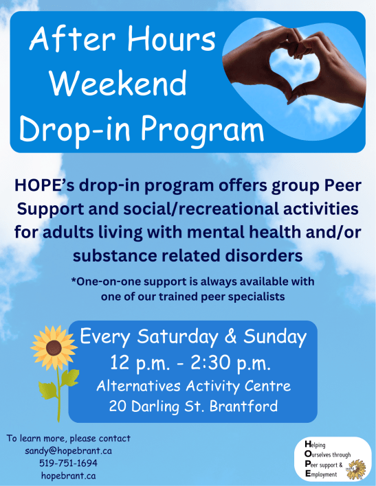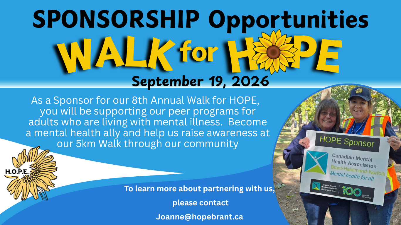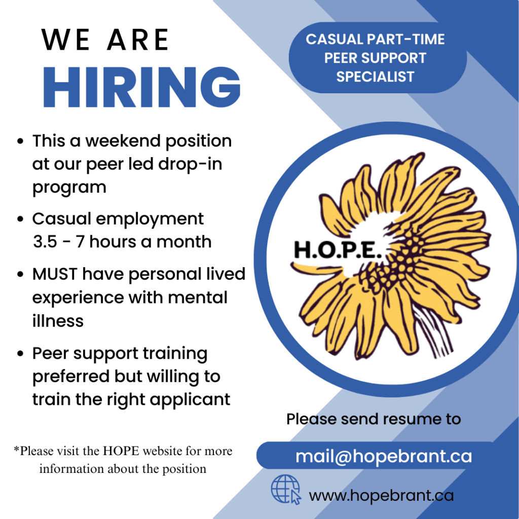 H.O.P.E. is an organization run by and for consumers of mental health services in Brant County. We work collaboratively with our community to help people in their recovery by providing meaningful employment, peer support and advocacy. H.O.P.E receives some funding through the Hamilton-Niagara-Haldimand-Brant Local Health Integration Network. We rely solely on donations and grants to provide programs and services.